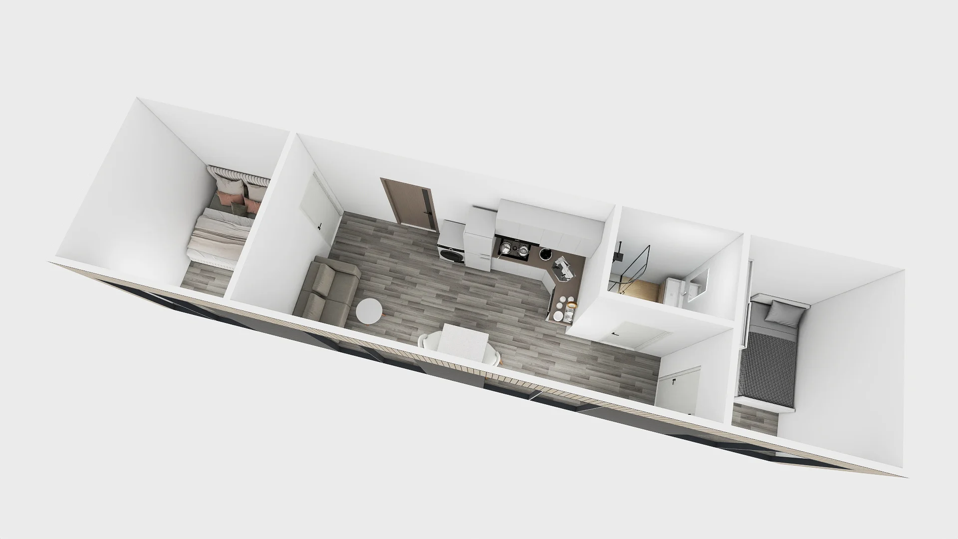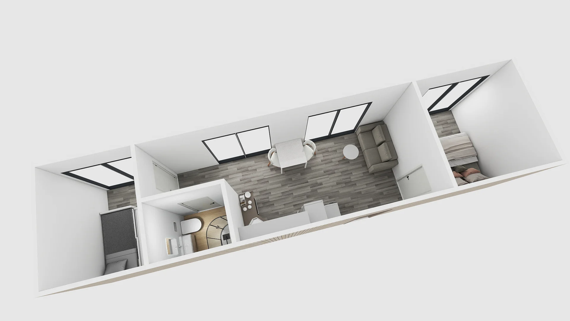 Zaletą tego domu jest jego funkcjonalność. Główną część prezentowanego domu stanowi salon z aneksem kuchennym. Na parterze zlokalizowano również dwie wygodne sypialnie oraz funkcjonalną łazienkę. Jest to idealne rozwiązanie domku letniskowego lub całorocznego dla 4-6 osobowej rodziny. Do budynku można dołączyć dodatkowy moduł, który będzie pełnił funkcję tarasu